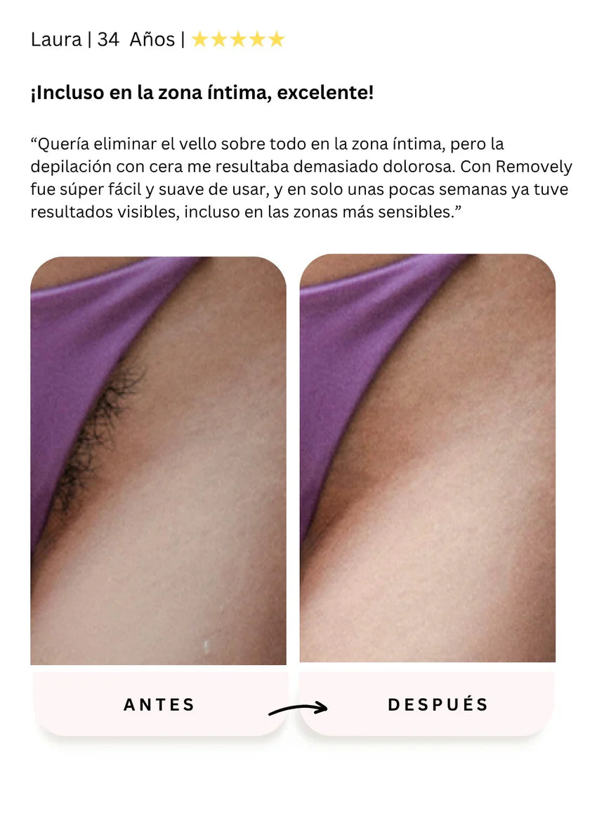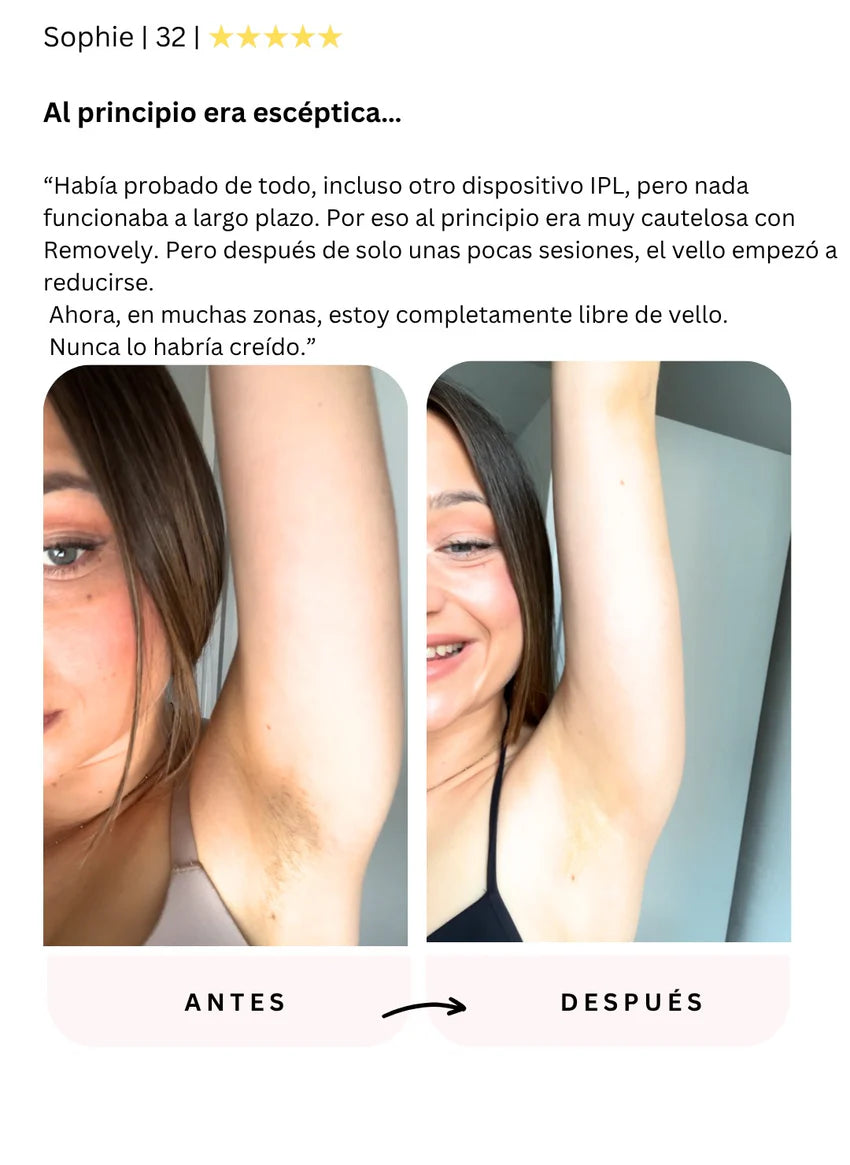 Muchas mujeres se preguntan si el IPL realmente funciona. Por eso, Removely ofrece nuestra exclusiva oferta de Prueba y Compra: puedes probar el IPL durante 60 días completamente gratis, sin pago por adelantado, 100% sin riesgo. Si estás satisfecha con los resultados, decides después de los 60 días. Si no estás convencida, simplemente puedes cancelarlo después—rápido, fácil y sin riesgos. Solo envía un correo electrónico a info@removely.de