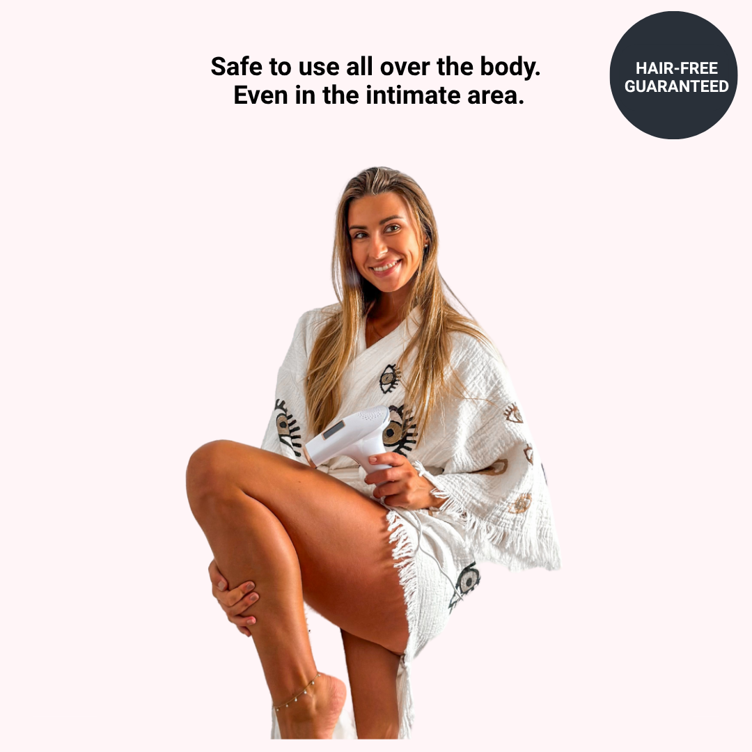 Ya sea en las piernas, las axilas, el rostro o la zona del bikini, el IPL es suave con la piel y puede usarse en cualquier parte. Incluso en las zonas sensibles proporciona una sensación agradable.